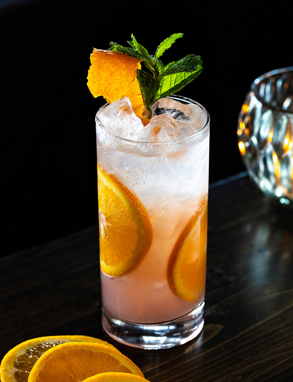 Combine all ingredients in a shaker with ice and shake vigorously. Pour into your favorite Collins glass and top off with club soda. Add 2 orange wheels and top with a sprig of mint to garnish. Then sit back, relax, and enjoy!