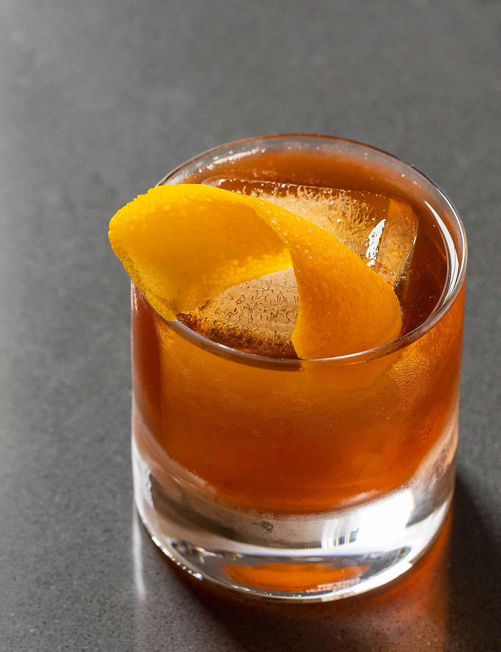 Combine, stir, and drain into a rocks glass and serve with a large cube of ice. Garnish with an orange peel.