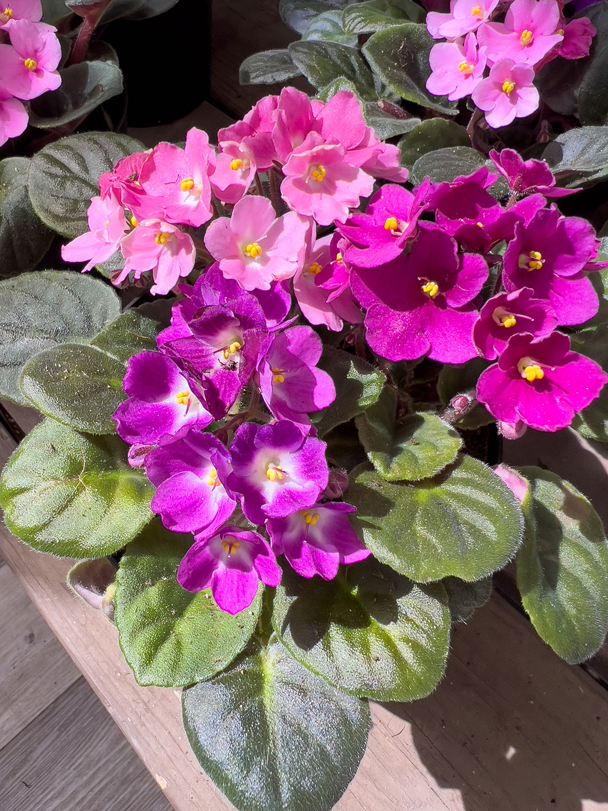 African violets need to be watered, of course, but the chlorine typically found in city systems can cause leaf spots. An obvious remedy is to water the dirt, not the foliage. As another preventative, simply leave a bottle of tap water out overnight to allow the chlorine to dissipate. Using rainwater or bottled distilled water is another option. Both, by the way, are equally handy if you happen to have hard (alkaline) tap water, which is also not good for African violets because it can raise the pH of the potting soil these acid-loving pretties call home.