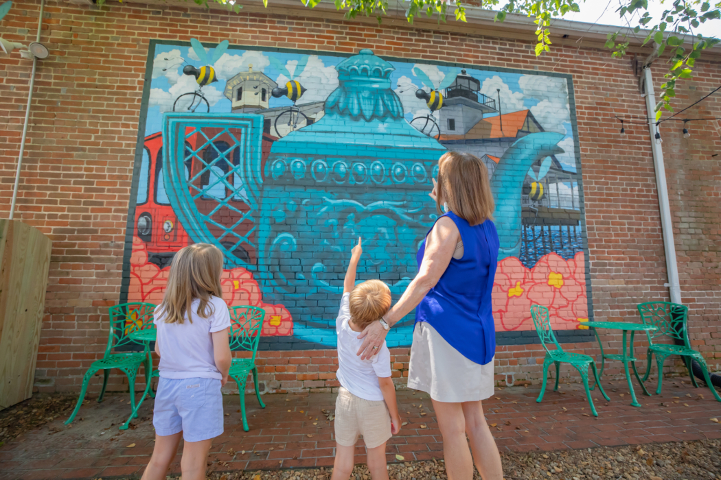 Locals are breathing new life into the arts scene. A new mural is on display on West Water Street featuring some of the town’s signature historic landmarks: the Edenton teapot, the Cupola House, the Roanoke River Lighthouse, and the Edenton Trolley.