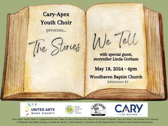 We invite you to join us at Cary-Apex Youth Choir’s Spring Concert! Weaving stories through song, from the Americas to Europe, Asia, and New Zealand, “The Stories We Tell” will take you on an unforgettable journey! This concert will showcase all of the CAYC ensembles and feature special guest storyteller, Linda Gorham. All ages are invited! You can purchase tickets ($5) on our website. www.CaryApexYouthChoir.org.