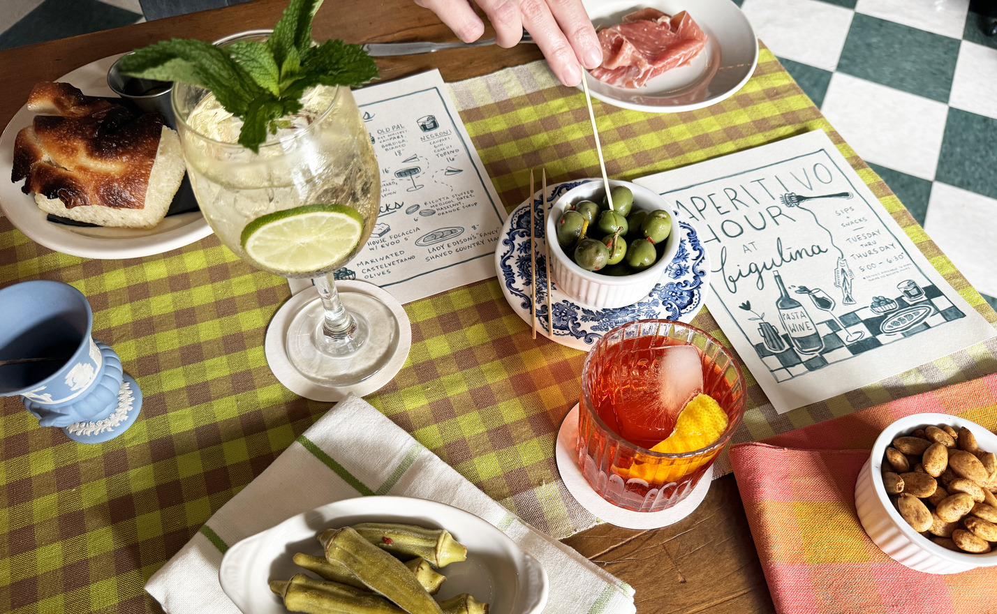 Figulina’s Apertivo menu includes these cocktails: Aperol Spritz, Old Pal, Negroni, Paper Plane, and Hugo Spritz, and snacks: almonds, focaccia, olives, country ham, and ricotta-stuffed medjool dates — or enjoy all as a platter.