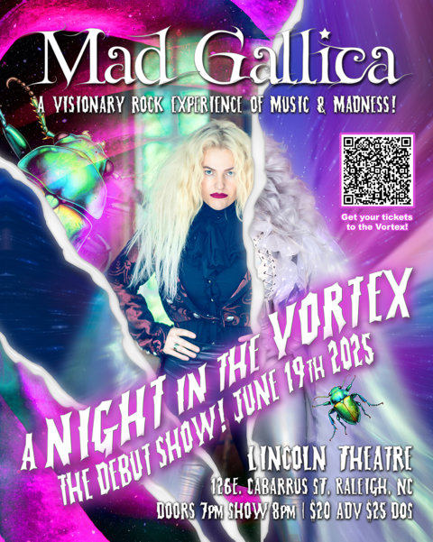 Mad Gallica will debut her electrifying and visually striking rock “popera” experience at Raleigh’s Lincoln Theatre at 8 p.m. June 19. Mad Gallica was the longtime touring keyboardist and backing vocalist for the Grammy Award-winning Swedish hard rock band Ghost. Mad Gallica’s debut concept EP, “Enter The Vortex: Act One” (2024), was recorded with a symphony in Prague and showcases her genre-bending sound — cinematic, high-energy and vocally commanding. Her music draws comparisons to Queen, Nightwish, Muse, and Lady Gaga, combining classical elements with a modern rock edge. Advance tickets cost $24.95. Day-of price $29.95.