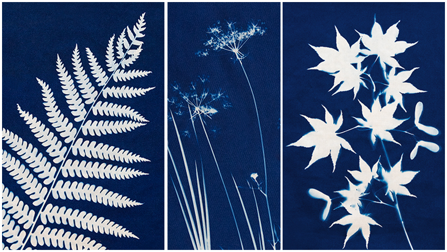 Mary Louise will explain how to make botanical “photograms” – direct contact prints of plants placed on sensitized cotton material and then exposed to sunlight. The developed print is then rinsed in a water bath and then left to dry. The final print will have a blue background and no color where the plant touched the material or left a shadow on the material. So, this process is a great way to celebrate the different shapes of plants.