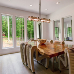 The house is further elevated by the custom dining table that parallels the girth of the oversized area for the table. Amanda found a slab of chamcha wood with live edge and soft curves which makes an indelible impression. Created by craftsmen at Phillips Collection, the one-of-a-kind table is a showstopper paired with the seatbelt chairs that flank it.