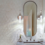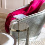 But all’s well that ends well, and Amanda’s favorite room is the transformed dining room. “The spectacular chandelier anchors the space with a hint of glamour and style,” she says about the ladies’ lounge. “We brought some contemporary elements into the room with fabulous showstopper animal-print swivel chairs with metal backs and soft pink fabric seats.” Patterned wallpaper and pale pink high-gloss walls complete the space.