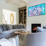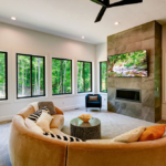The design element that makes the space shine for Amanda is the fireplace renovation. With a construction-grade mantel and TV niche for an outdated television the homeowners no longer used, the existing fireplace was, as she describes it, “understated.” She installed a flat-screen television over the hole, removed the existing mantel, and installed large-format white tile to create an expansive, clean design that complements the new living room furniture and carpet and creates a dramatic focal point.