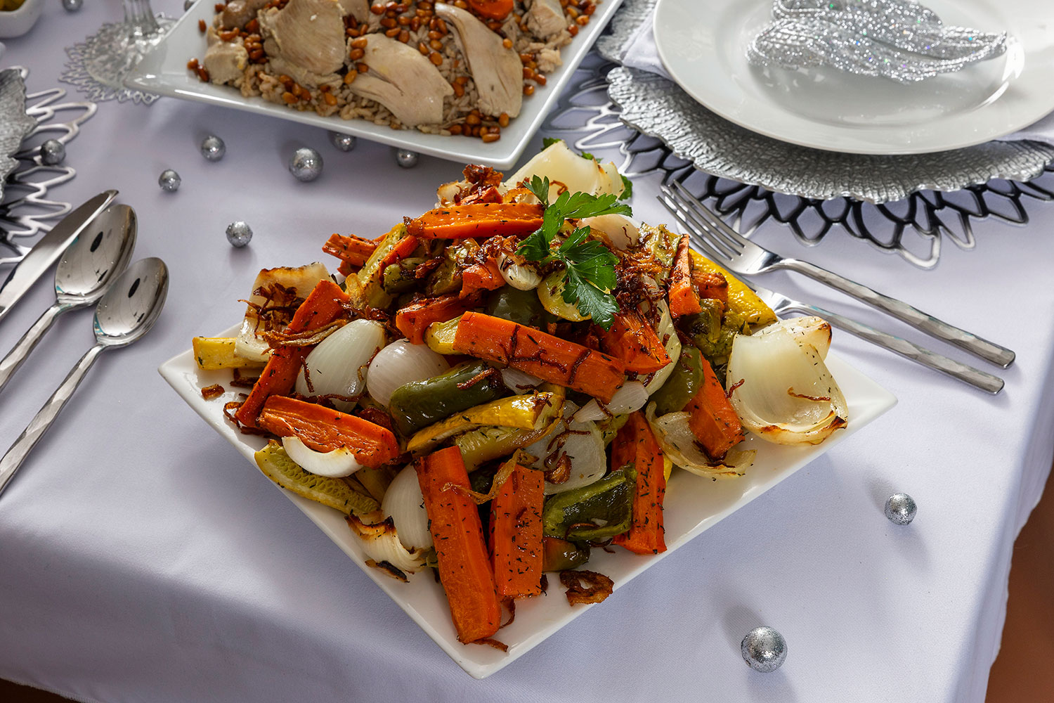 The celebration starts with every corner adorned with spreads of flavorful dishes. Cold mezza sets the tone for sharing and grazing, featuring an array of mixed nuts, pickled vegetables, cheeses and olives, and traditional stuffed grape leaves. Small stuffed pita appetizers called sambousik, and an array of salads and dips served with pita leave no appetite unsated.