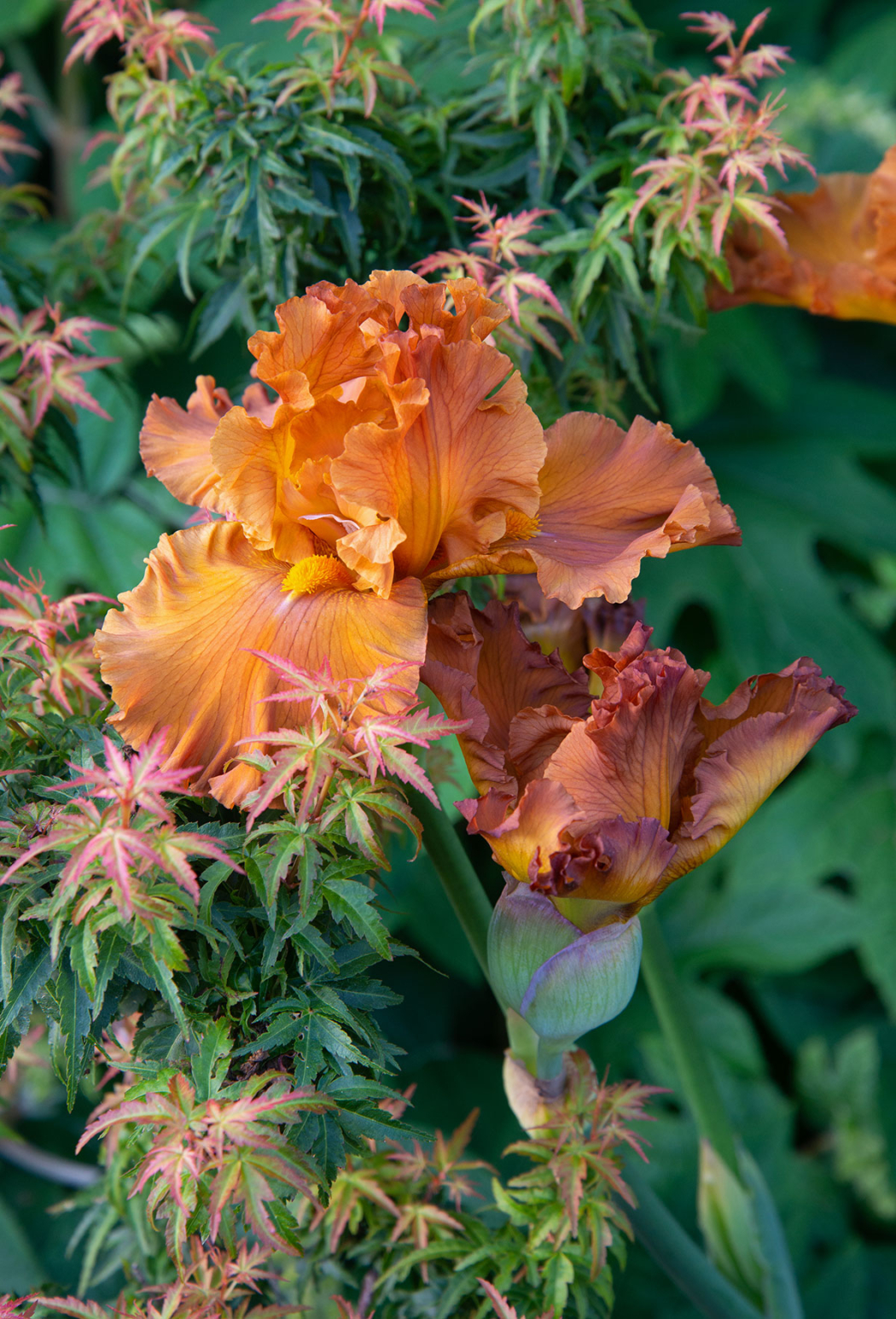‘Golden Panther’ bearded iris playing nice visually with a Japanese maple
